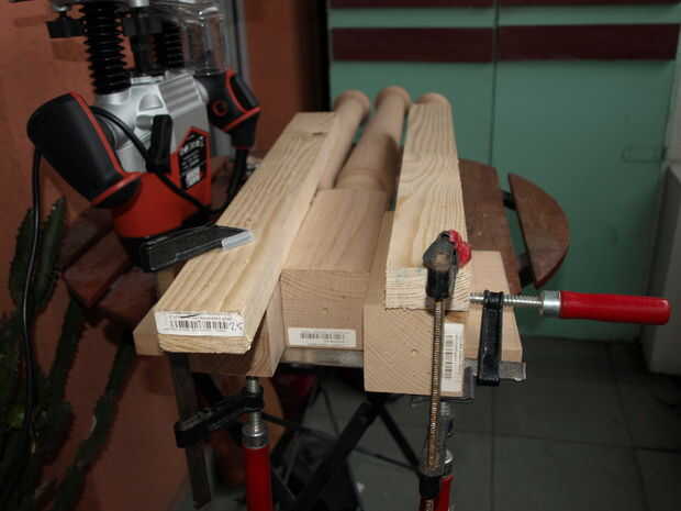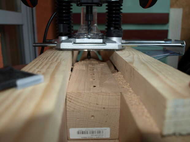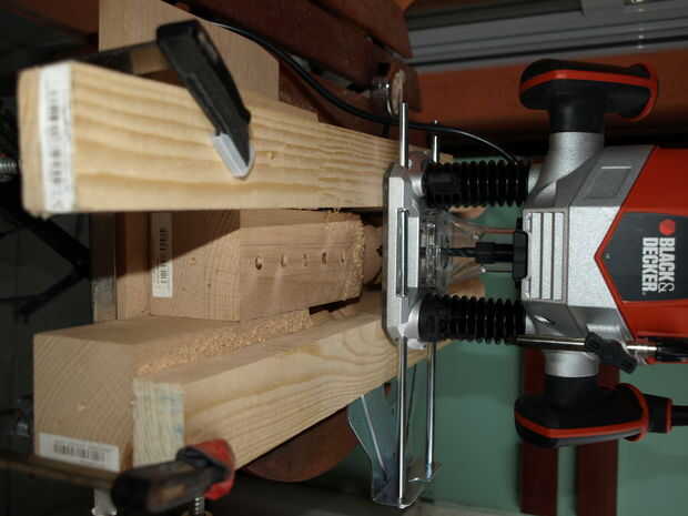 Así que puse una broca taladradora en el router: es demasiado larga, así que tienen que encontrar una puesta a punto, que podría trabajar: puedes ver las fotos, cómo lo solucioné esto. Sujeta las piernas juntas y fija las piezas entre ellos para perforar en una profundidad necesaria.