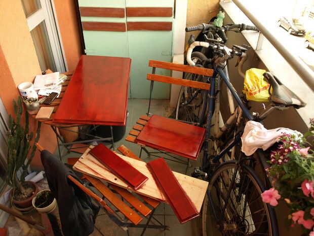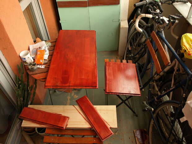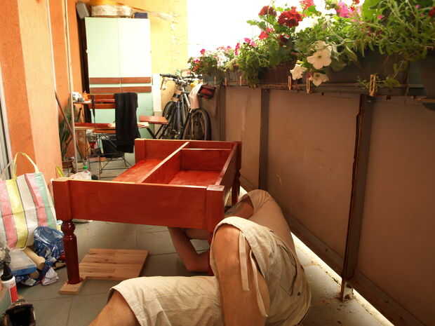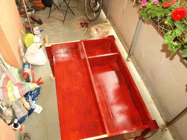 Así que después de dos capas de protector, 24 horas de secado tiempo cada uno), pintado a dos capas de woodpaint de color "pino rojo".