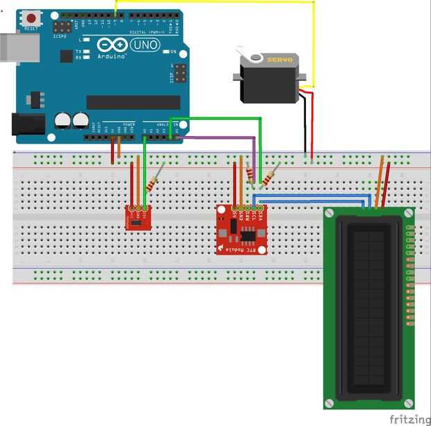 Encima es un diagrama de Fritzing que he hecho para representar más claramente la configuración de circuito, es bastante simple y sencillo.