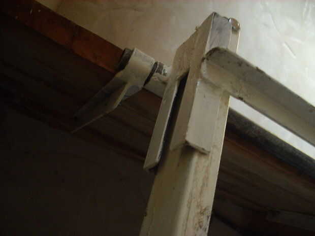 Esta corredera tiene forma de caja o túnel de hierro, dentro de la cual se desliza la escalera esos 45 cm de la "plataforma de aterrizaje". Está articulada a dos soportes mediante un trozo de caño, formando una bisagra va atornillada bajo el piso del altillo. Los laterales de la corredera están unidos entre sí por un travesaño de hierro ángulo, para darle solidez.