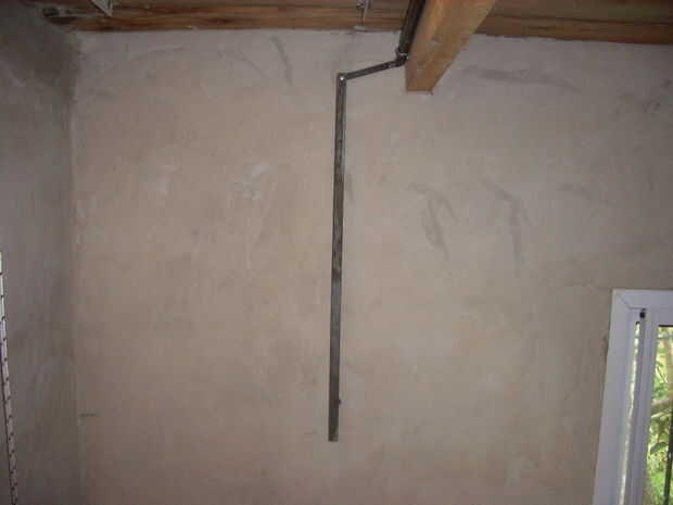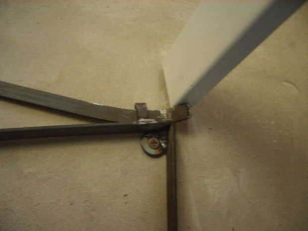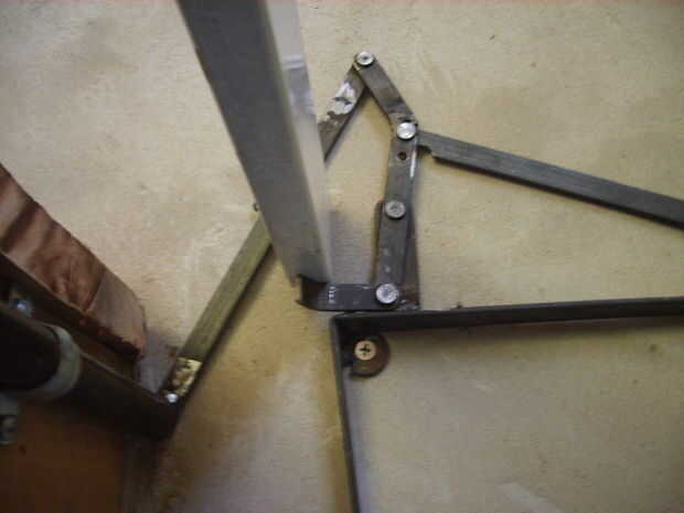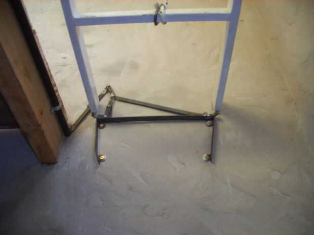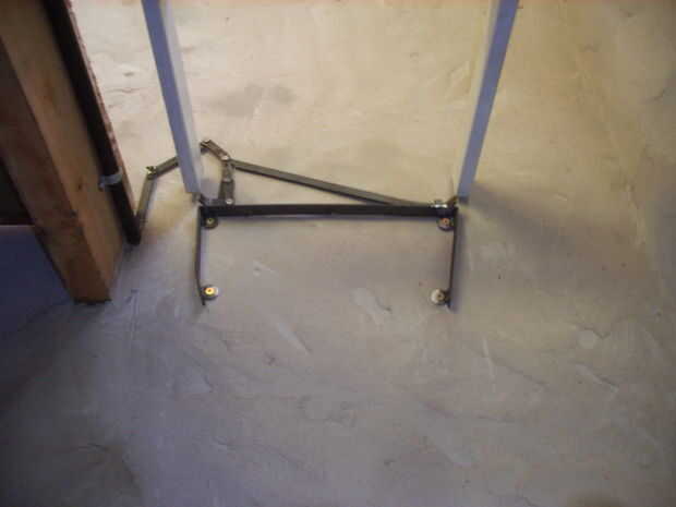 Como dije antes, yo no puedo arriesgar la escalera será alguien (probablemente yo), ya que pesa unos 12 kg y sería un grave accidente. Así que había que asegurarse de que un bloqueo cuando se dobla para arriba. Hice un chasis ancho 35 cm, que es el ancho interior de la escalera. Este chasis está atornillado a la pared donde están las patas de la escalera cuando se. Hice en la barra de hierro 1/2 pulgada un mecanismo de palanca simple, tipo de perno, que se extiende a los dos pernos de lado, para soportar el peso de la escalera. Este mecanismo es operado en el lado opuesto del taller, con una barra de hierro que cuelga cerca de la bobina, para actuar cuando la escalera alcanza finalmente la posición elevada. El movimiento de la varilla se transmite al mecanismo de la palanca a través de un tubo giratorio de hierro fijado al suelo de la buhardilla.