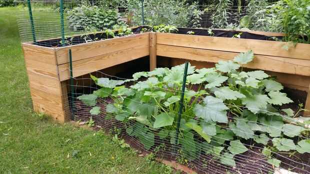 hice este 16' x 4' levantó jardín de madera, tubería de desagüe de perferated, paño sleave y dos piezas cortas de tubo de PVC. El sistema de riego está diseñado para filtrar agua que es introducitdo que drenan tuberías por la manguera o regadera. Igu
