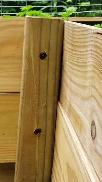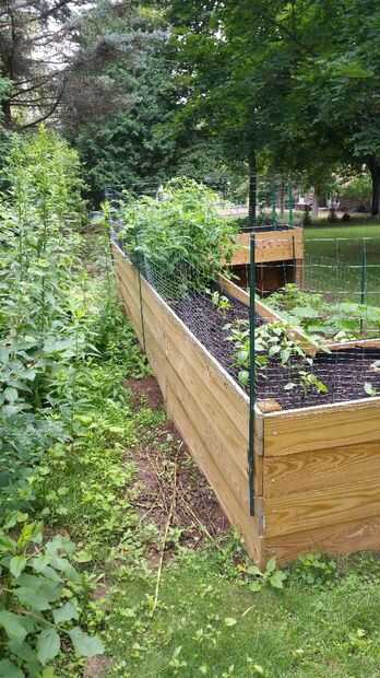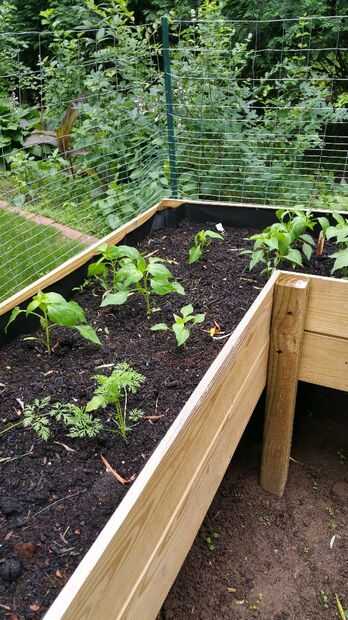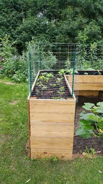 Los lados de madera son los 2 x 8, la parte posterior tiene 5 tableros de 12 pies y 5 tableros de 6 pies. Cada uno de los lados tienen 5 tablas de 8 pies, total hasta 10. Los dos delanteros extremos cada tienen 5 tableros 2 pies cada 10 total. Las partes interiores no van hasta el suelo por lo que sólo tuve que usar 2 de cada lado para contener la suciedad. Los lados son cada 6 pies de largo (4 en total) y los que a lo largo del espalda/interior son 8 y 6 pies de largo (2 de cada uno). Esto hizo la cama elevada aproximadamente 15 pulgadas de profundo y 2 pies de ancho en cualquier un punto. No estaba segura si esto era bastante aunque como usted puede decir cosas están creciendo muy bien.