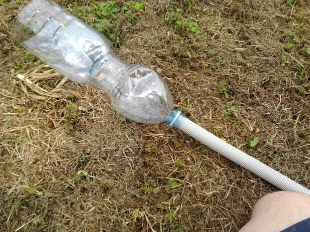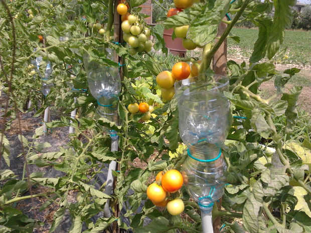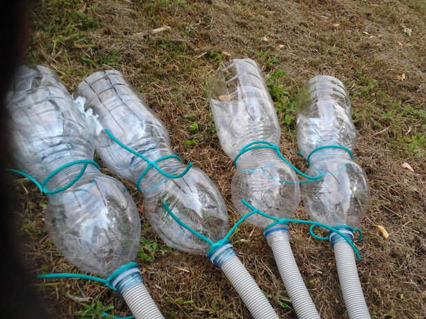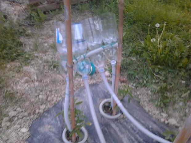 Tuve otras cosas que hacer que estratégicamente ajuste cada botella con su tubo de gota, que a su vez fue pegado en la base de la planta a pocos centímetros de la base de la planta sí mismo.
