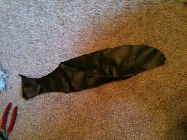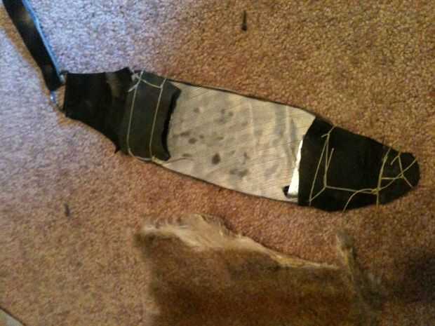 5. ahora tome su cuero superior (o en mi caso, lanzan) y póngala sobre su vaina hasta ahora. Coloque sobre la vaina y envuelva ligeramente hacia atrás, usar esto para su ventaja. Comenzar a coser en la espalda para ocultar sus lazos y coser los lados de la vaina pero ten cuidado, que si usted coser demasiado, el cuchillo no será capaz de ser forrado. Ahora han cerrado hasta la vaina y el cuchillo debe ser capaces de entrar y salir.