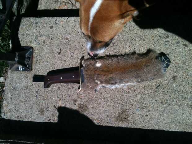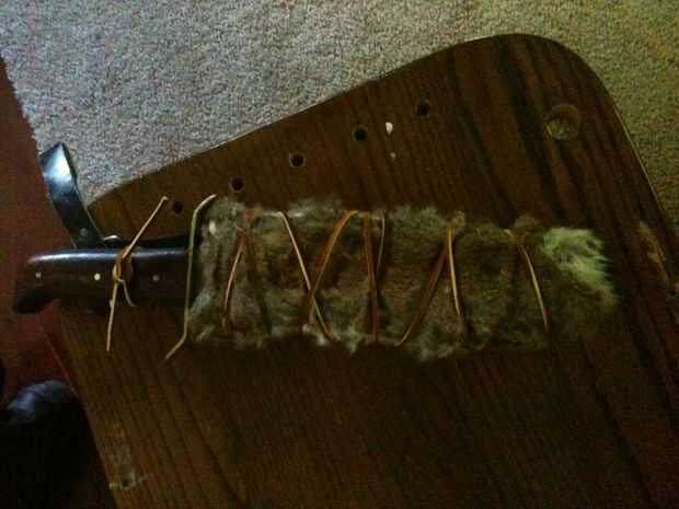 6. corte dos ranuras cerca del punto donde la manija del cuchillo raja para fijar cuerdas o hebillas.