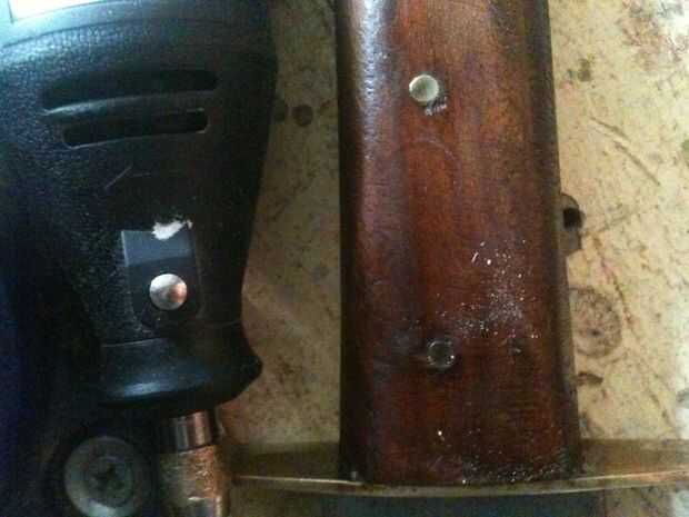 6. Si la empuñadura es de bronce, entonces uso una cabeza de cepillo de latón para estos pasos de empuñadura, si acero, acero. Ahora suavemente retocar con el pincel, cualquier puntos malos en la empuñadura y pulir sus pernos de la manija. Si usted tiene una empuñadura de bronce, pesa tus pociones primero porque si usas un Brasso para pulirlo y no hay muchos perjuicios en la laca, el Brasso tira de la laca de. Sólo quitó mi laca en la mía y trabajó con el latón crudo.