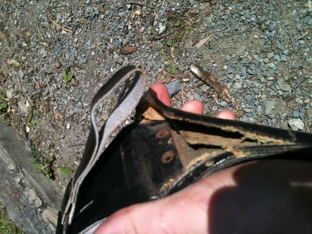 4. Corte las tiras de cuero y coserlas en la parte inferior de la vaina sobre los pedacitos de chapa. Asegúrese de hacer puntadas robustos para fijar el metal el cuero del respaldo. Este cuero es refuerzo del pegamento.