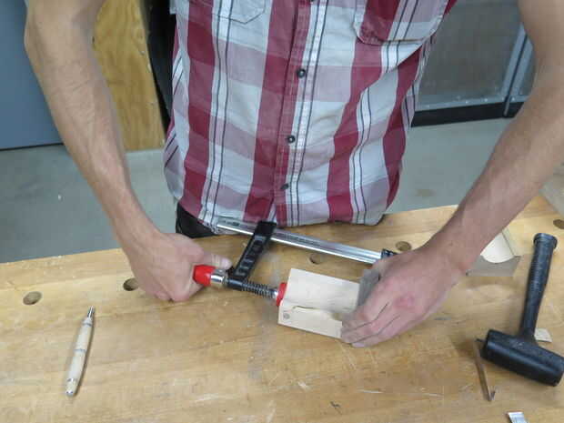Corte un bloque cuadrado de la pieza de nogal alrededor de 3/4 pulgada de espesor. Las otras dos dimensiones deben coincidir con la base de la estación de levitación. Ahora a seguir adelante y pegamento en el extremo y fijarlo con la abrazadera como se muestra en la foto de arriba.