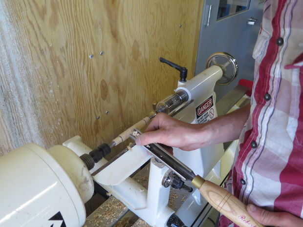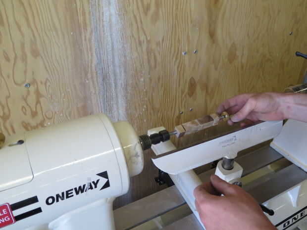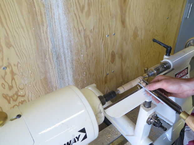 La acción de la cola en el extremo libre del mandril de apriete y ajustar el resto de la herramienta antes de encender el torno. La forma de la pluma no es crucial como baje a los casquillos en ambos extremos. Yo prefiero plumas gordas y curvas simples, pero algunas personas como un contorno más ondulado así que no dudes de ir salvaje.