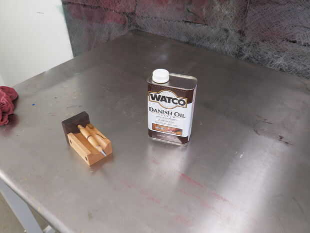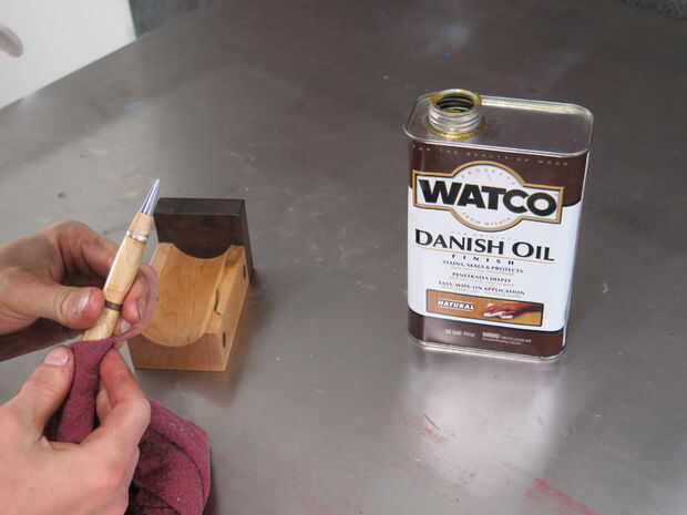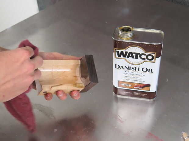 Utilicé un aceite danés Watco para este proyecto pero realmente funciona cualquier acabado en madera. Lo que usted prefiere está probablemente bien. Revestimientos de madera la mayoría se aplican con un trapo en lugar de un cepillo y requieren múltiples capas para lograr un final deseable.