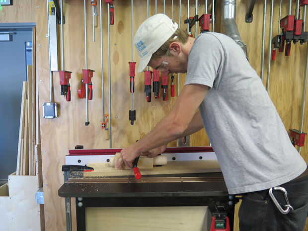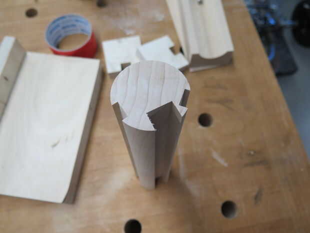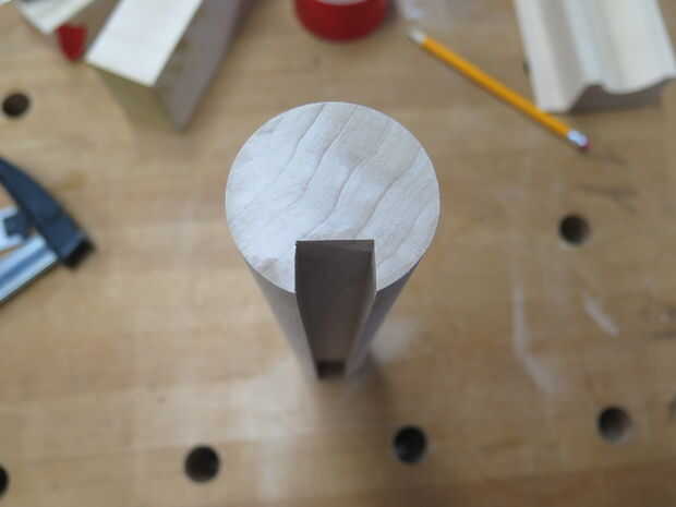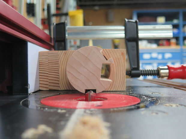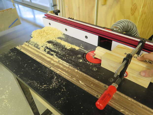 Asegúrese de que sus canales son perfectamente rectas y puntiagudas exactamente hacia el centro de la espiga. Esto no es fácil de hacer. Como se puede ver en las fotos, uno de mis canales más pequeños no está muy centrada. Para hacer esto primero, sujete la clavija en la plantilla y coloque sobre su mesa de fresadora. A continuación, ajuste la guía de la mesa de router hasta que la broca está centrada en la espiga y cortar aproximadamente un cuarto de pulgada en. Los pedacitos de madera contrachapada no necesitan ir muy lejos en que no está sosteniendo un autobús, un poco de fuerza de sujeción.