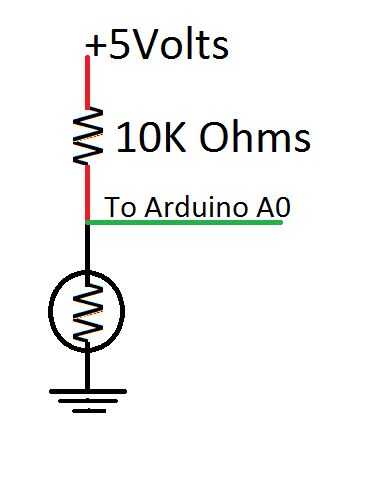 El sensor de infrarrojos es una fotorresistencia conectada en un divisor de tensión. VCC o 5 voltios pasa por una 10K resistencia de Ohm, y el sensor real, que entonces entra a la tierra. Para medir el voltaje, podemos leer los valores de entre el Sensor y la resistencia fija. Esto va para arduino A1. Se encuentra físicamente en la configuración idéntica como el LED infrarrojo. Hice a un pequeño adaptador que pugs de plomo de un sensor en mi adaptador, que conecta a 5 voltios y A1, luego el otro cable de sensor sólo va a tierra.