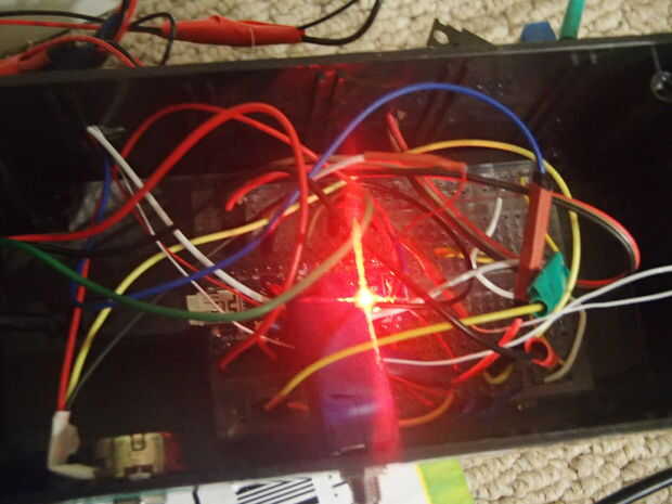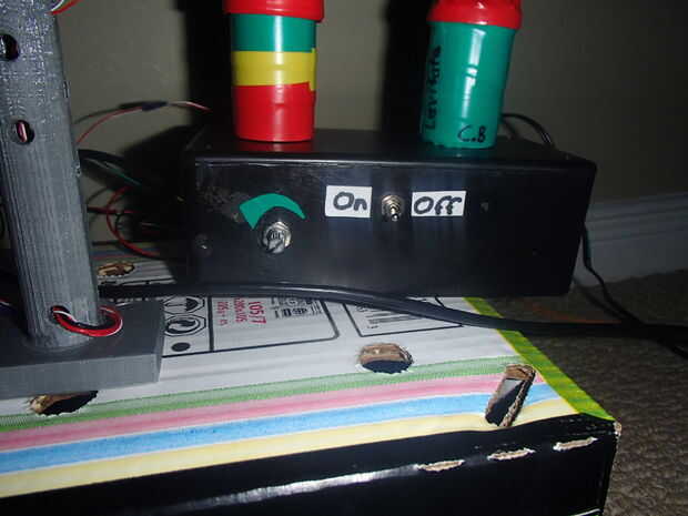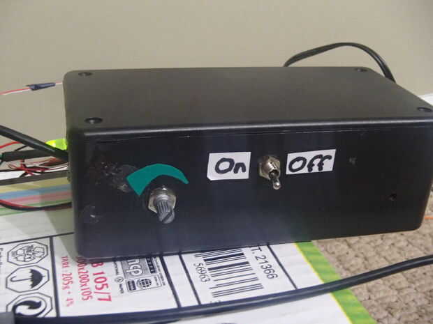 El caso es uno que encontré en mi sótano, y simplemente tiene una placa en la parte inferior con cinta de doble cara. Hay 6 agujeros, uno para el Arduino Nano USB cable, uno para el interruptor, uno para el potenciómetro, uno de los cables de conductor del electroimán y uno de los cables. Simplemente caliente-pegué el controlador del electroimán a la parte posterior. El calor de ese circuito no es un problema, ya que el MOSFET puede manejar más de 2500 vatios y mi electroimán es 5 vatios. Todos los cables que salen de la caja tienen que estar caliente pegan para evitar que se salgan de la caja.