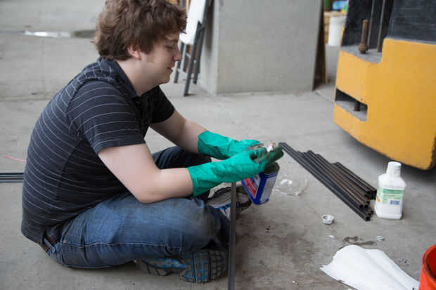 Antes de hacer cualquier cosa con el acero, tomar algunos acetona y un trapo y haz scrubbin'! Acero limpio acepta pintura en aerosol o capa del polvo mucho más fácilmente, y la capa dura para más de largo sin formar escamas. Toma algún tiempo para eliminar la grasa negra sobre el acero, pero nos encontramos con acetona (o alternativamente aguarrás) hace un buen trabajo de limpieza de. Después de unos minutos, el acero debe más o menos el mismo aspecto, pero sus dedos no ensucien al recoger el canal de acero. Para la capa mejor absoluta, también puede el metal de chorro de arena (convenientemente, TechShop también tiene un arenador de la arena)