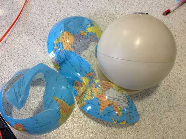me di cuenta de que la cubierta del globo era en realidad una fina capa de plástico (calor acoplado a la bola o algo) que podía ser pelada apagado. Deslizar un cuchillo entre el plástico y la cubierta y me quita todo el mundo abarcando desde ambos lados.