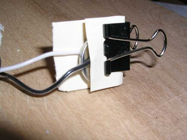 Para encender la vela, coloque los dos cables en caras opuestas de la batería y envuelva el conjunto en un pliegue de papel. Sujete con un clip binder para mantener los cables en su lugar. He encontrado que un clip de carpeta tamaño medio sólo encajará en la parte inferior de la tubería de PVC si las orejas de la abrazadera se doblan cerrado otra vez. Una sola batería va a durar muchas horas.