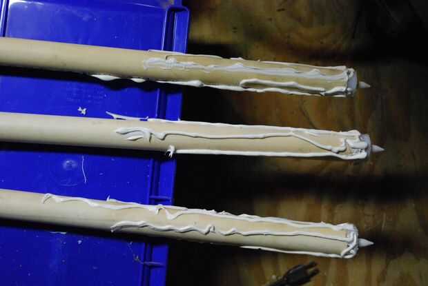 Con la pistola de calafateo, ejecutar cuentas de sellador hacia abajo los lados de la tubería de PVC para simular la cera del goteo. No necesitamos ser demasiado quisquilloso aquí--queremos que mire al azar y fluido. Colocar el tubo de PVC en una abrazadera, prensa u otros medios de holding vertical puede ayudar aquí. Deje que el sellador seque durante la noche. Una vez que la masilla se refuerza, el conjunto puede ser rociado con pintura blanca, teniendo cuidado de máscara de la "llama" primero.