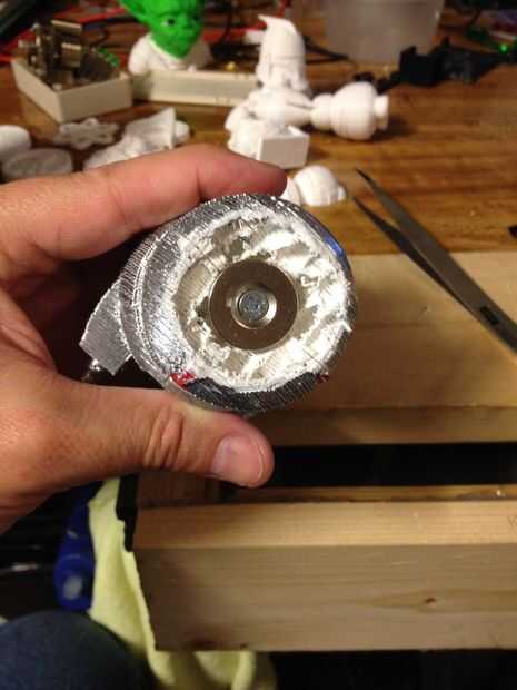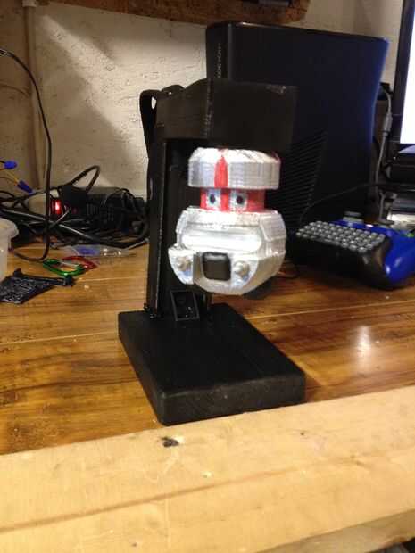 Usé una sierra y cortar la parte superior de la cabeza de VINCENT. No simplemente porque es película más precisa, sino porque necesitaba un lugar plano para poner el primero de dos juegos de imanes. Uso del neodimio imanes con construcción en agujeros de los tornillos que he comprado fuera de eBay. Utilicé tornillos de ojo, uno en la base y otro debajo de VINCENT. Luego utiliza un imán de neodimio plana y había atornillado a la parte inferior de la base superior de la estructura. Después pegué a VINCENT al imán, se utiliza lineas de pesca para conectar entre los tornillos de ojo. Al principio intenté un hilo, pero no era lo suficientemente fuerte y continuado romper. Así que subió las roscas. Sean más visibles, pero aún no tan malo como sólida cadena.