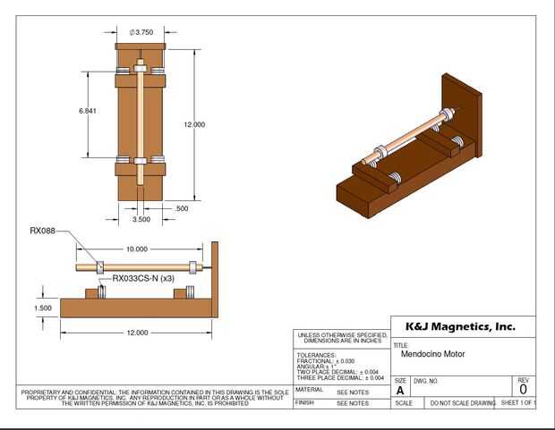 El motor consta de un eje de giro que se sostiene por los imanes repelentes, estabilizados por un punto contra una pared de descanso. Es alimentado por paneles solares montados en el eje de giro, que generan las corrientes a través de bobinas de alambre aislado.