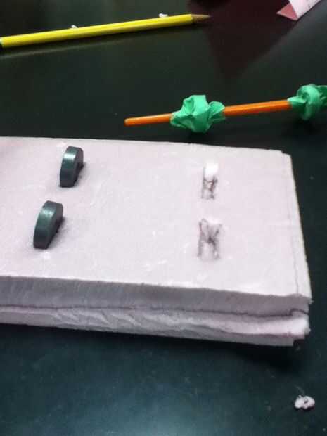 1. corte 4 uniformemente colocados los agujeros en el tablero de la espuma o placa y poner los imanes en los agujeros así: