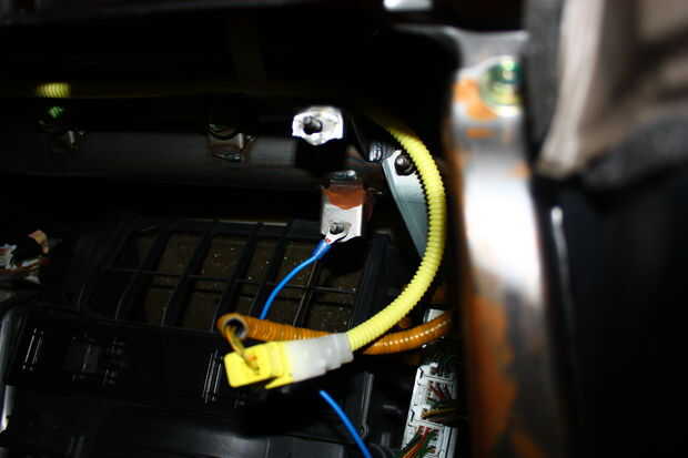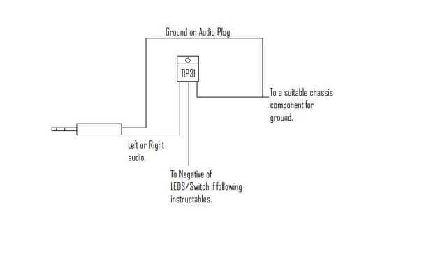 Usted necesitará quitar el reproductor de CD otra vez para esto, primero tomar el Transistor TIP31 y poner algunos hilos en él que son cerca de 6 pulgadas de largo. El cableado es el siguiente en la imagen, o aquí es una descripción, la pierna izquierda va al cable verde o amarillo en el conector de CD o el alambre aislado sobre el cable de audio, luego la pierna derecha va a un punto en el chasis que actuará como un terreno, también puede conectarse a los cables pelados en el cable de audio para que sea más sensible al sonido , entonces el medio va al negativo de los LEDs o el interruptor si usando uno. Entonces estás acabado y se golpe a su música.