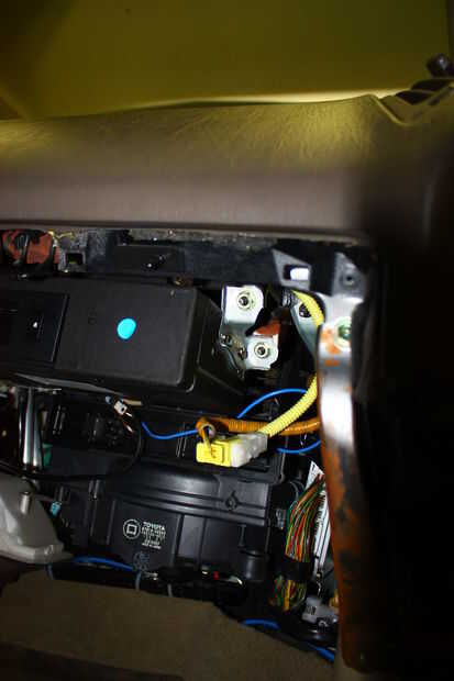 Ahora que se retire la guantera se puede llegar al reproductor de CD, si te fijas en la foto verás tiene 2 tornillos en el lado derecho es lo mismo la izquierda que no es suficiente espacio para una foto. Tienes que utilizar una llave de 12mm para quitar estos mientras se retira el último perno sostenga el reproductor de CD para arriba con la otra mano, es engañosa en su aspecto es bastante pesado. Baje suavemente al piso y desconecte el enchufe empujando en el clip en la parte superior el conector y tirando, es un ajuste muy apretado por lo que toma algunos tirando, luego use un destornillador para empujar el clip de retención de la parte inferior de su titular en la parte posterior del reproductor. Ahora usted puede dejar de lado el reproductor de CD.