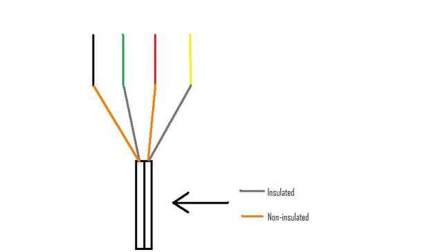 Opción 1: Hacer un desnudo en los cables y luego hacer un hueco en los hilos para pasar otro cable a través de, la orden de los cables debe ser como sigue negro, verde, rojo, amarillo. Los cables pelados del cable de audio deben ir al negro y cables rojos y el alambre deben ir para el verde y el amarillo como la imagen. Sólo asegúrese de que se alternan como en la foto. Conectar los cables, empujando a través del orificio en los filamentos de envolver alrededor de los cables stock y suelde. (ADVERTENCIA: SOLDADURA EN ESPACIOS CERRADOS ES MUY PELIGROSO Y PUEDE HABER INFLAMABLES ASEGÚRESE DE MATERIALES CERCANOS EN EL COCHE) Luego los aísle con cinta o calor shrink como se muestra.
