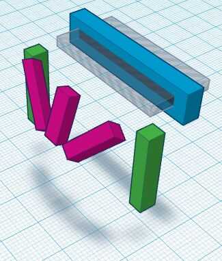 Sólo uso 2 cajas como columnas. Añadir una caja horizontal, con un agujero en él, a la parte superior. Luego gire 3 cajas más pequeñas por lo que encajan en el tubo fino.