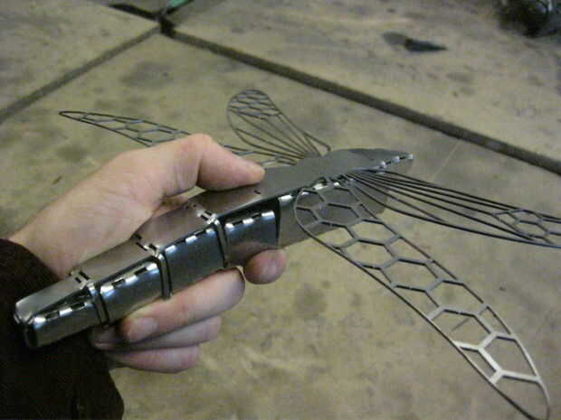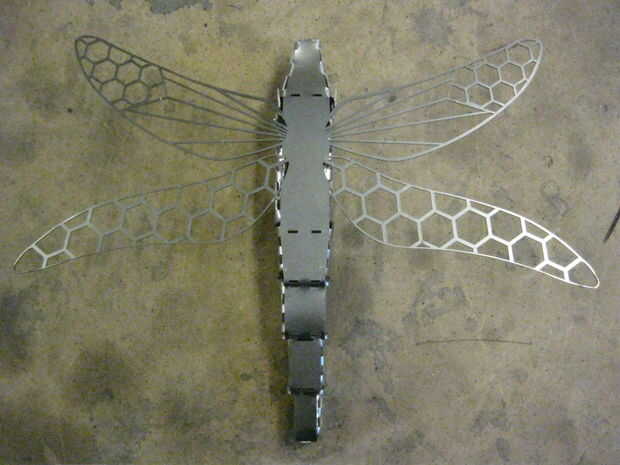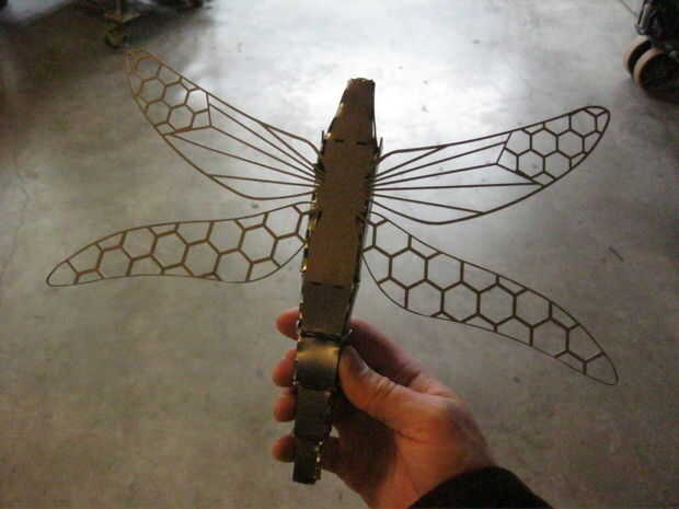 Después de enviar los archivos, fue a su laboratorio y observó el proceso como el cortador láser gigante hizo su trabajo. Desde aquí, doblé mi libélula para arriba a lo largo de las perforaciones en que había dibujado antes.