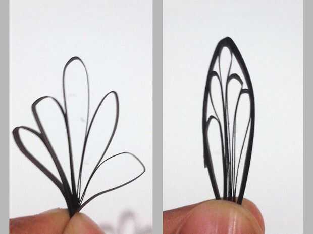 Para las alas una tira entera de papel y lazos de cuatro en el centro, siendo el más alto y uno en el borde de ser la más corta. Luego rodar el resto del papel alrededor de los lazos para mantenerlos juntos. Hacer cuatro tales alas y colocarlos a ambos lados del cuerpo principal.