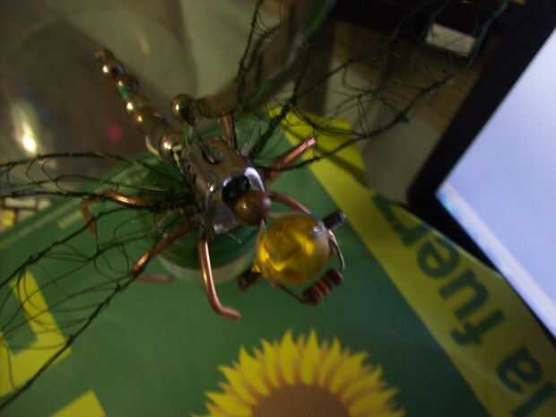 5 pm ... Hecho la base de la lámpara con alguna basura en mi garaje y colgar la libélula por la parte media del cuerpo. I´m pensando en algún pequeño dragón vuela para utilizar en ordenadores Portatil colgante con controladores de clip...