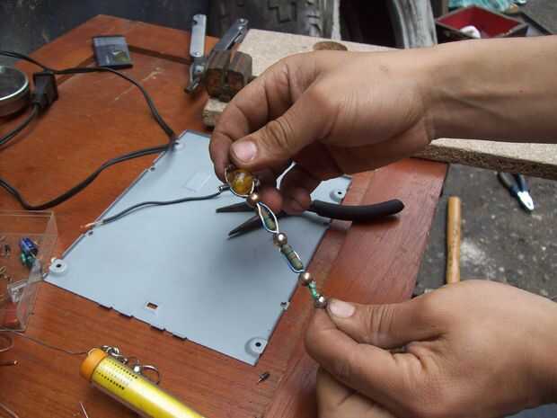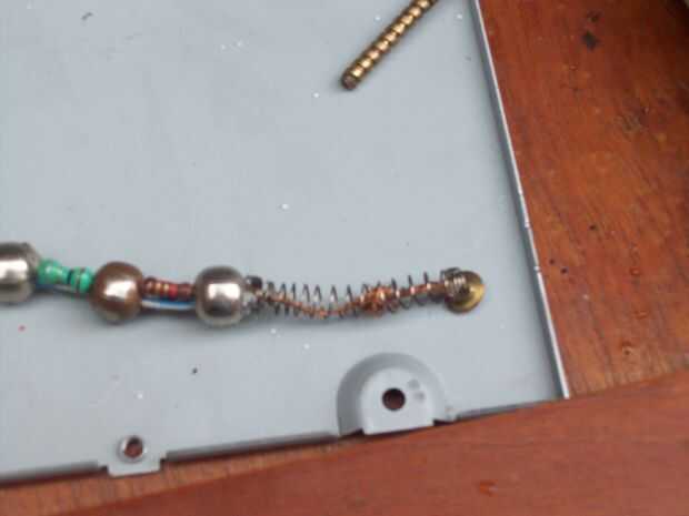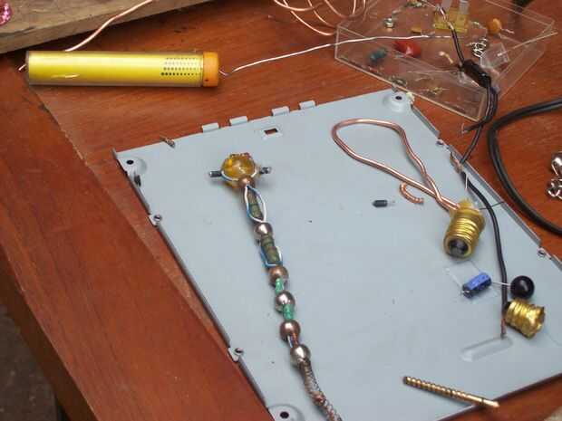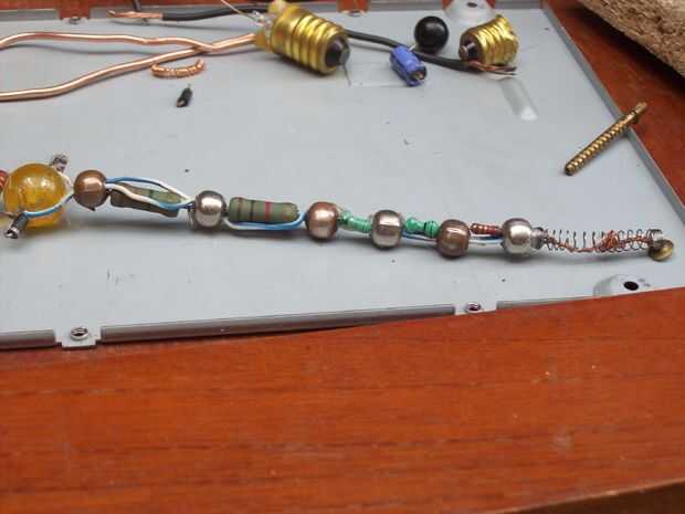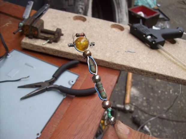 Primero, una bola grande de un collar de una dama... (Don´t dice mi esposa), a continuación, un pequeño grano de otro collar, luego un resistor o transistor... I´m no estoy seguro... y así sucesivamente, y así sucesivamente, finalmente le puse algunos cool cooper wire. primero pegan con una pistola de pegamento caliente y luego con el hierro de LG.