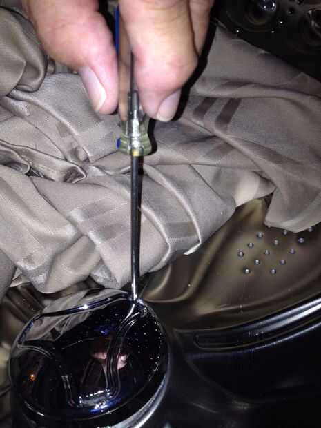 La tapa está en el centro de la parte inferior de la tina. Como se muestra, tiene tres lengüetas que quebró en su lugar. Los destornilladores de hoja plana miniatura se presionan en dos de las ranuras de la parte superior de la tapa. Cuando presionado firmemente en las ranuras y se inclinó hacia afuera ligeramente desde el centro, los destornilladores desvían suavemente las pestañas, desbloqueo de un labio inferior. Suavemente jale hacia arriba los destornilladores mientras inclinándose ellos hacia fuera y la tapa liberará a un lado. Manteniendo el lado lanzado para evitar que se remonta en su lugar, pasar un destornillador a la tercera ranura y abrir su ficha. La tapa se puede levantar y retirar.