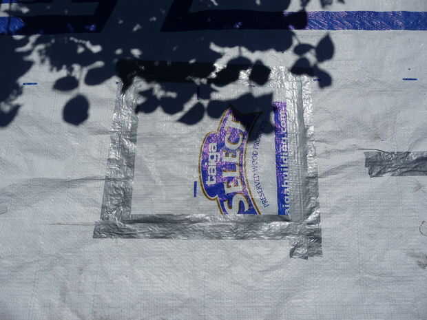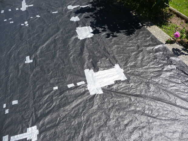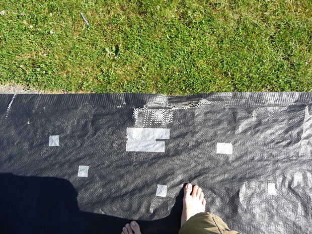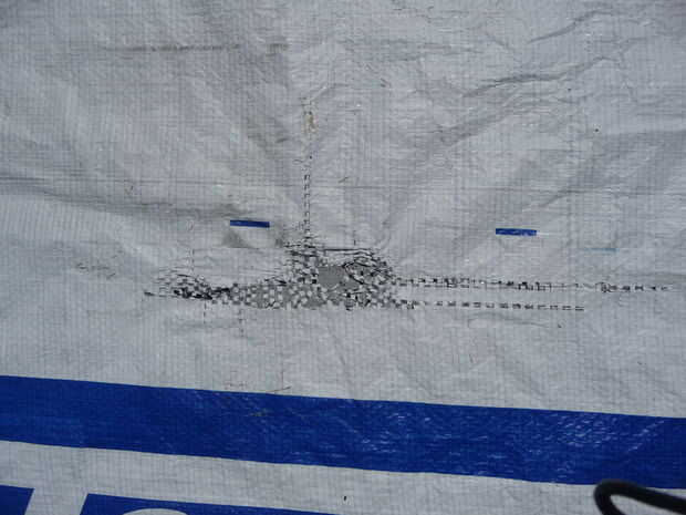 Fotos 7 + 8: Áreas más grandes del daños pueden requieren parches, cortar un pequeño trozo de lona (sin agujeros) y cinta adhesiva sobre la zona en cuestión.