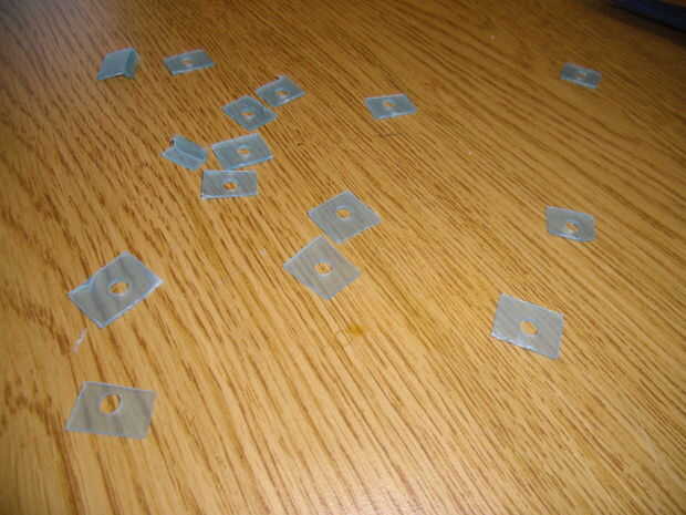 Con un corte bonito de IKEA, pude fácilmente cortar el Polypropyline en tiras de plástico con agujeros en ellos. Entonces yo cortar las arandelas individuales, manteniendo la tira de plástico a lo largo entre el pulgar y el índice. Montón de arandelas baratos!