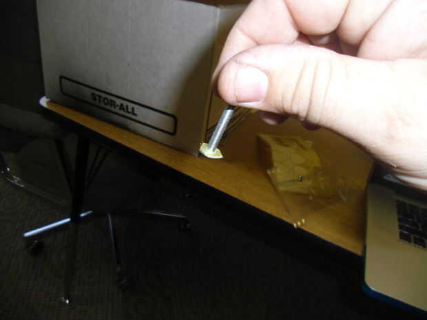Eric dijo había comentado uno demasiadas veces sobre el bloque de 2 x 4 que había servido para reemplazar el viejo botón que faltaba en el Hackerspace Variac. Así que caminó a la pizarra y bosquejar un diseño para un pomo, una con estilo y Pizazz.