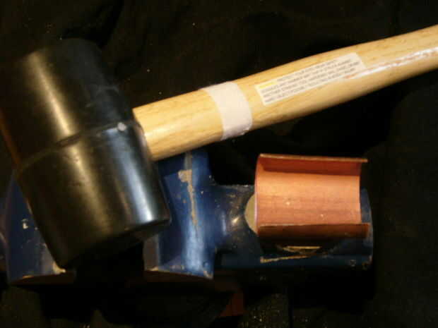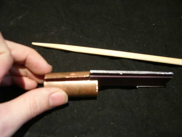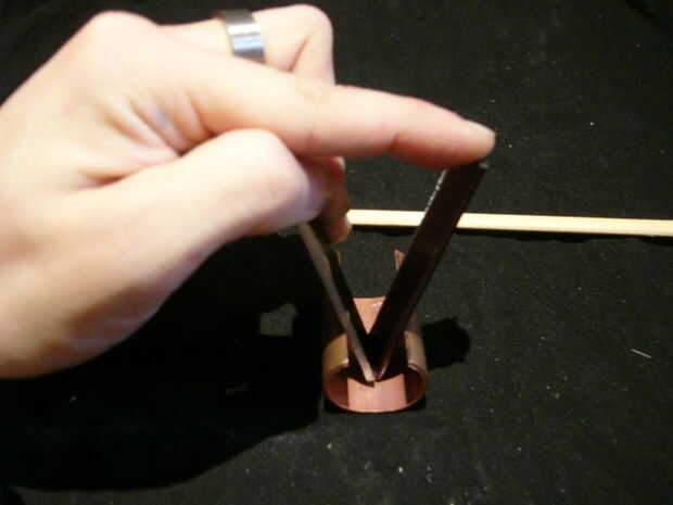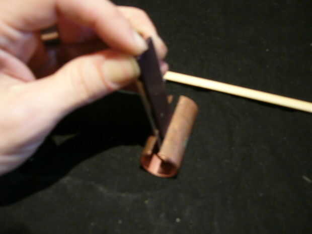 Use un destornillador o palillos para difundir el split lo suficiente para insertar dos piezas de metal de desecho. Luego mover las piezas de metal a punto de incrementar su apalancamiento. Luego se extendió la parte superior de las piezas de metal separada. (Esto es un buen ejemplo de palancas de orden segundo.) Por último, puede usar los dedos o algunos plyers difundir el cobre lo suficiente como para empezar a martillar.