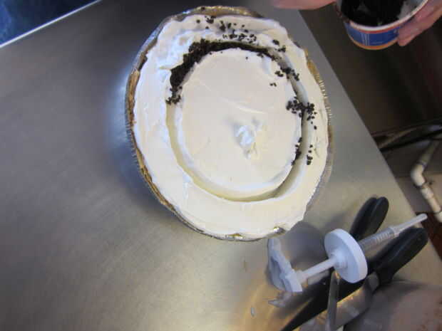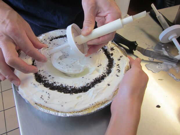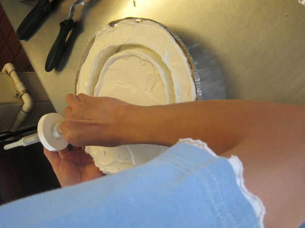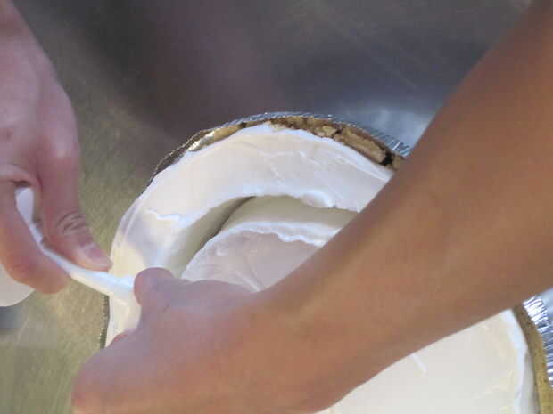 Una vez que la trinchera ha sido cavada, llenarlo con su relleno de elección; en este caso, pastel crunch. Séquela dando toquecitos abajo cuidadosamente por lo que es sólido. Repita en la otra.