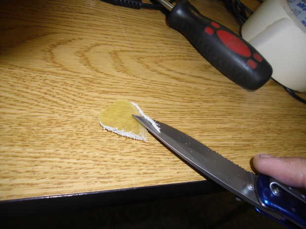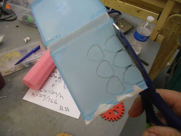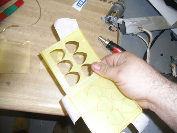 Probar una serie de selecciones en un color diferente, luego perforar los picks de la polypropyline. Retire la cinta de adhesiva Shurtape y tomar a una lijadora de banda. Un lado de la hoja de poly de ambos bordes de la arena, pero arena al otro lado. Retire el exceso con un buen y afilado cuchillo.