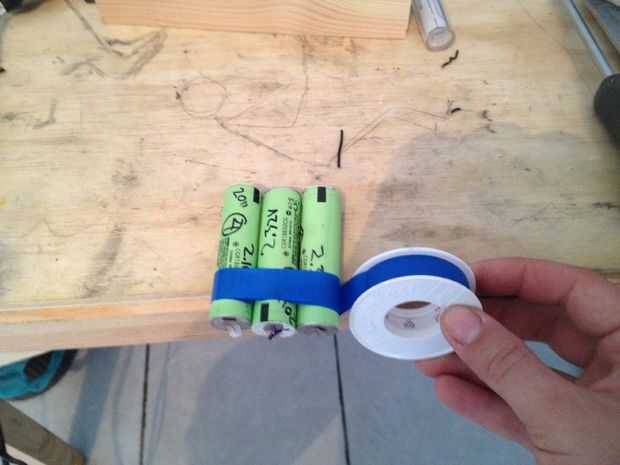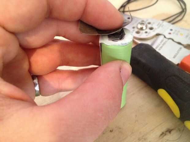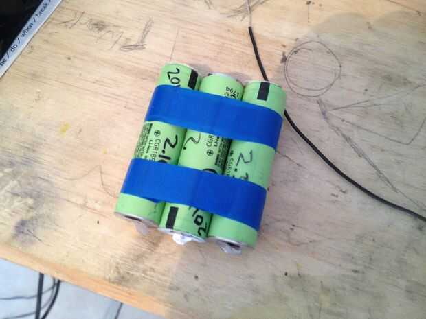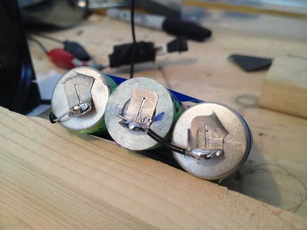 Primero cortar las lengüetas de metal por lo que no se a de largo. Lijado la superficie con papel de grano arena 220 para estar listo para soldar. Ahora juntamos el primer conjunto de baterías y pegarlas con cinta aislante. Ahora soldar piezas cortas de cable a los extremos. Estoy haciendo una batería serie 3 pack para tener la primera y la última batería + en la misma dirección. La batería media es al revés. Al soldar celdas de litio es importante que no esté demasiado caliente y demasiado. Me gusta doblar la lengüeta metálica para arriba y para soldar en él para que la batería consigue demasiado caliente. Empiezo por soldadura a un alambre largo para el negativo de la batería primera. Entonces suelde un cable corto para conectar el + del primer a-de la segunda. El conectar el + de la segunda a los - de la tercera/último batería. La posible terminal de la batería último obtiene un alambre largo. Me gusta usar negro para el primer cable largo negativo y el rojo para el cable largo positivo. Es importante con cinta adhesiva el cable largo abajo en el centro de la manada para que no tiren de la batería.