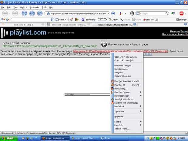 Paso 4: en la parte superior, hay un rectángulo con una barra de desplazamiento en el lado, necesitará recorrer todo el camino y encontrarás un enlace que termina en mp3. Si tienes tunestor, haga clic con el botón derecho el enlace y haga clic en "descarga directamente a iTunes". Si no tienes tunestor, puede haga clic en guardar como... o Guardar destino como...