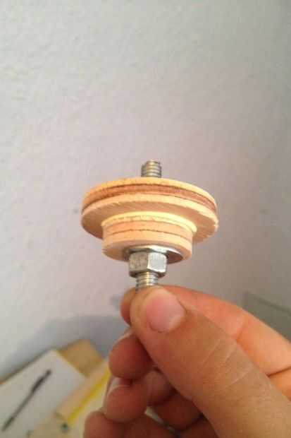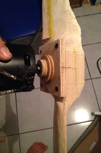 Cortar 2 círculos con la sierra cilíndrica. Pega el eje en el centro y pega un cuadrado de 3.5x3.5 pulgada de madera contrachapada de 3/8 a lo. Entonces usé 4 tornillos en las esquinas para sujetar la hélice al motor.