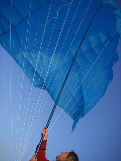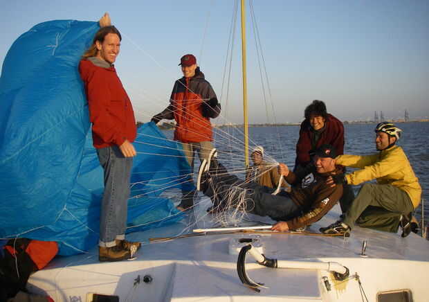 Aquí estamos navegando con la cometa de nasawing de metros cuadrados 16 Pete Lynn. Tuvimos cerca de 40 metros cuadrados de superficie vélica antes la desarboladura. Teniendo en cuenta la reducción de área y el hecho de que la elevación de la cometa para arrastrar cociente no es grande, es sorprendente lo bien que funciona. Cuando estamos en viento sucio o luz, Pete controla el borde de ataque de la cometa con una caña de pescar. Sin mástil, vela y aparejo en la forma, el barco es espacioso y ordenado.