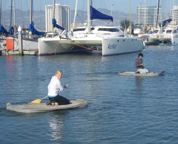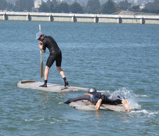 Dan intenta outrun raid pirata de Eric. Es una carrera entre Dan moderno "janitoring" standup y el estilo de Eric retro Tom Blake laydown.