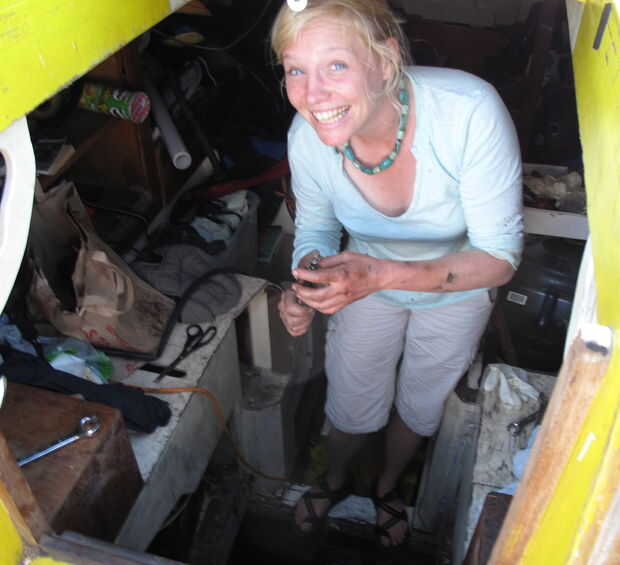 Lamentablemente al ejecutar un seco tienes aire en las líneas y ya no funciona la bomba de inyector de diesel. Tienes que purgar las líneas. Y parece que tenemos una fuga en el sistema, razón por la cual el depósito de combustible estaba vacío en el primer lugar. Afortunadamente el capitán Jo sabe exactamente qué hacer. Ella abre la caja torácica del motor y se pone en marcha! Fue criada por una pareja de viejos motores diesel al igual que este.