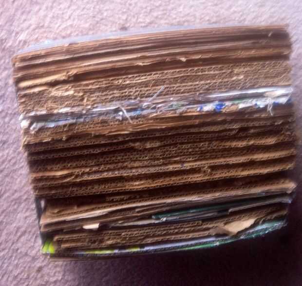 Una vez que tienes una pila de planchas de cartón de 4" de grosor comprimir la pila abajo y bungle junto con cinta adhesiva de la cinta.