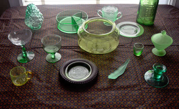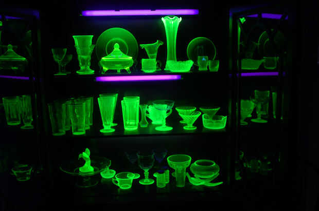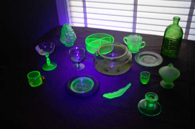 La segunda imagen muestra varios de la fluorescencia de las piezas adecuadas. Sin embargo, la imagen es un poco engañosa. El vidrio muy izquierda del animal doméstico, tazón de fuente de tortuga no es el resplandor en el tallo de las otras piezas, el vástago del vidrio a la izquierda de ella está la placa a la taza derecha superior es vidrio de vaselina real pero no tiene un real alto contenido de uranio, se ilumina un poco pero no para iluminación no mostrar bien.