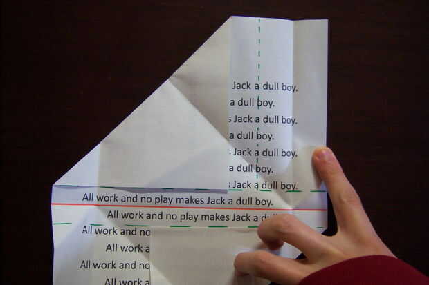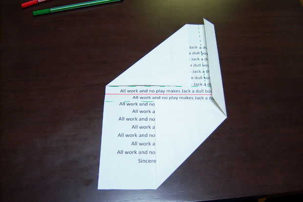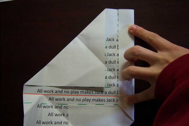 Gire la carta 90 grados por lo que es orientado otra vez el camino alto (retrato). Tomar el borde superior de la derecho de la letra y doblar a la izquierda, manteniéndola paralela al borde original y otra vez dejando aproximadamente un espacio de media pulgada desde el borde del triángulo hecho por los pliegues anteriores. Yo he marcado la línea aproximada que se debe doblar a en verde. [Fig. 1 & 2]