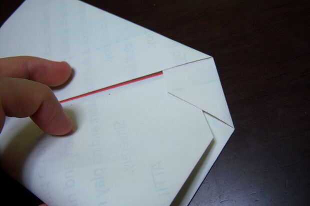 Luego pliegue la esquina inferior izquierda arriba hacia la referencia de la línea (en rojo), como se en el paso 4, pero esta vez para meter en la ficha a lo largo de la orilla derecha de la letra. [Foto 2]